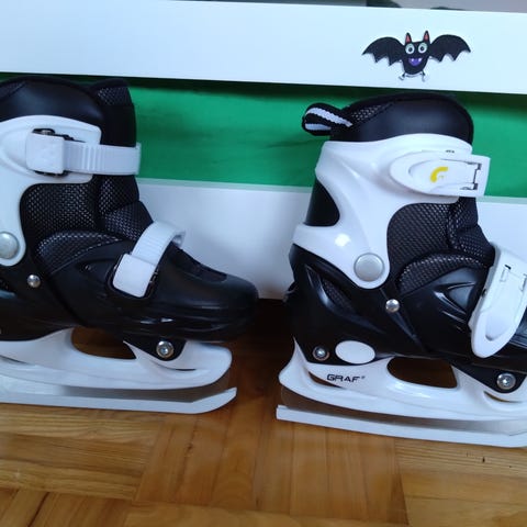 Ehjät, pientä pintanaarmua ulkoreunoissa, ei vaikuta luisteluun. Säädettävissä olevat, koko 28-31. Jämäkät kiristykset. Nouto.