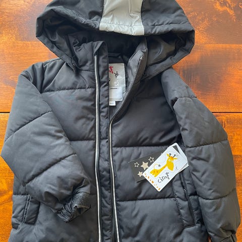 Ciraf merkkinen toppatakki kokoa 92. Vetoketjusta puuttuu yksi hammas, ei kuitenkaan vaikuta vetoketjun toimivuuteen mitenkään.