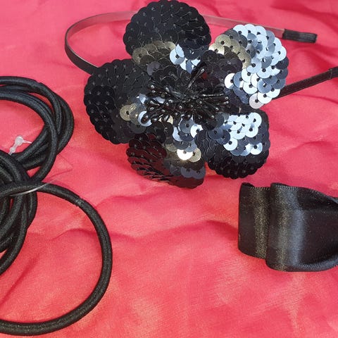 • 2€/kpl kankaisia hiustenkiinnittäjiä koristeella (musta ja roosa/oranssi)