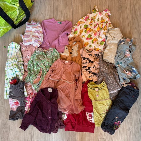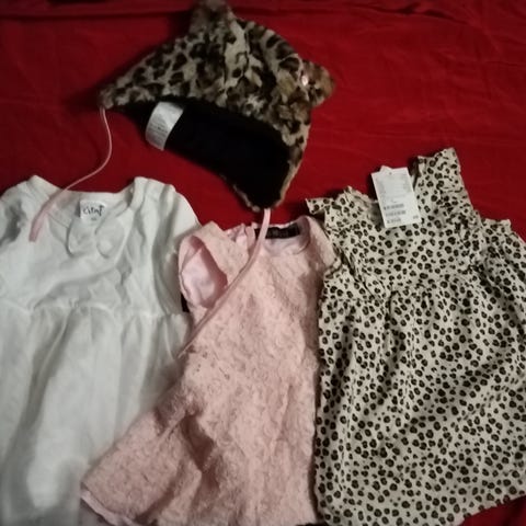 Vaatepaketissa ihana kerrostettu mekko, valitettavasti siinä pieni tahra keskellä, jää vähän vyön alle. Peuhun college jumpsuit. Kolme collegepaitaa. Kaikki kokoa 80. Hyväkuntoisia.