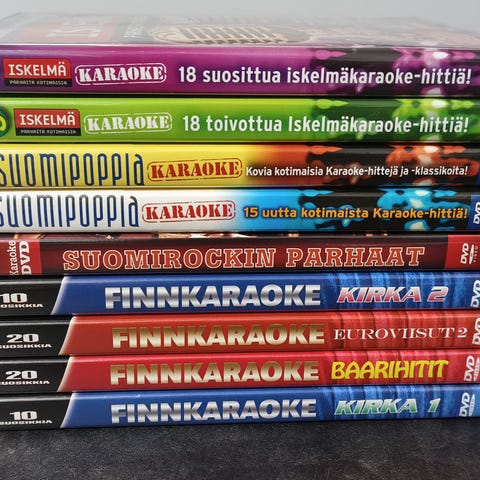 5 karaoke levyä Suomipop, Iskelmä ja Finnkaraoke DVD-levyt sisältävät karaoke-esityksiä eri vuosikymmeniltä. Paketissa on useita DVD-levyjä, jotka tarjoavat monipuolisen valikoiman suomalaisia kappaleita karaoke-esityksiin.