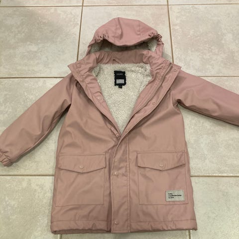 Kuling lasten vk-takki, koko 98, vaaleanpunainen väri, valmistettu polyamidista ja polyesteristä. Vedenkestävä. Takissa on irroitettava huppu. Kunto erinomainen, ei merkittävää kulumaa.