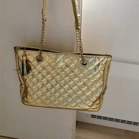 Kerran käytetty vihreä olkalaukku säädettävällä hihnalla ja pikku pussukalla. Leveys noin 25 cm. Ei käytönjälkiä.