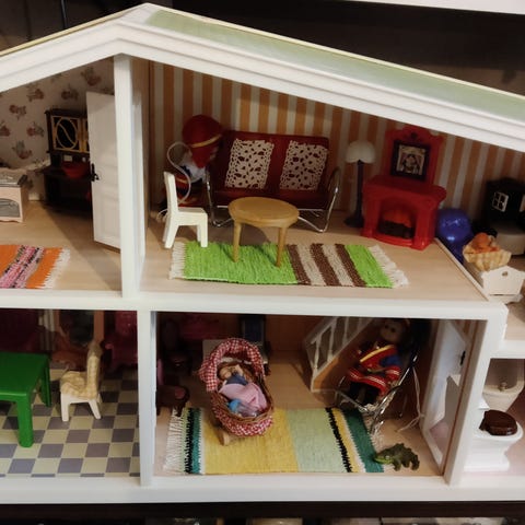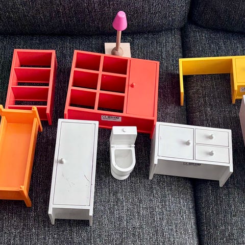 Vitriini kulmakaappi 16cm korkea ja9cm leveä. Pöytä 16x9x7cm.