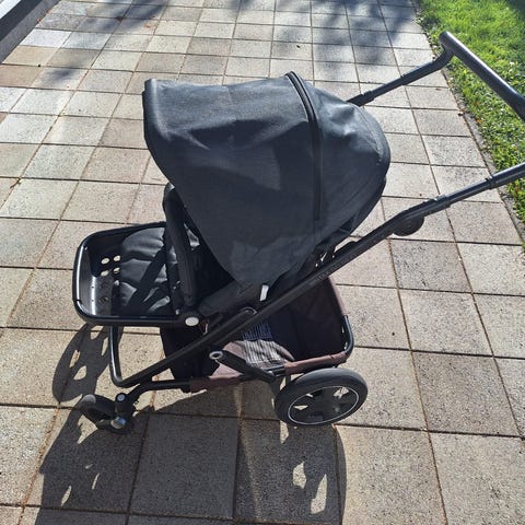 Vaunuissa mukana hyttysverkko, sadesuoja (tämä jo käyttöikänsä päässä), kääntyvät pienemmät renkaat eteen, adapterit turvakaukalolle.