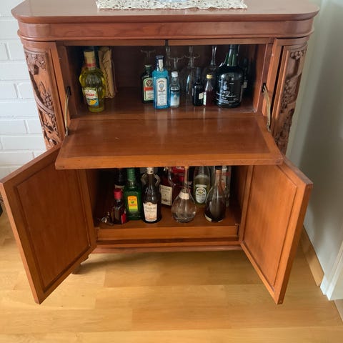 Hieno täyspuinen acazia baarikaappi. Pituus avattuna 185cm, leveys 49,5 korkeus 110,5. Pituus suljettuna 93cm. Kaappiin on laitettu pyörät alle. Nouto, kaappi on tosi painava