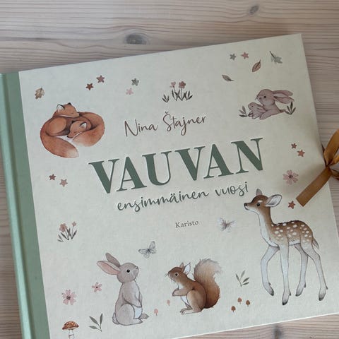Kosmoksen kaunis vauvakirja ”Alku”. Uusi, ovh 34,95. Kuvissa esimerkkiaukeama :). Takakannen sisäpuolella kätevä tasku johon saa laitettua esim valokuvia tms.