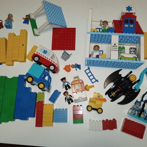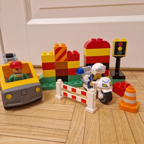Lego duplo poliisisetto, kunto hyvä. Sisältää kolme poliisia, yksi moottoripyöräpoliisi ja moottoripyörä, poliisiauto, vilkkuvalot (toimii) ja palikoita.