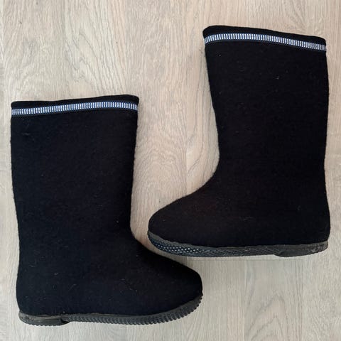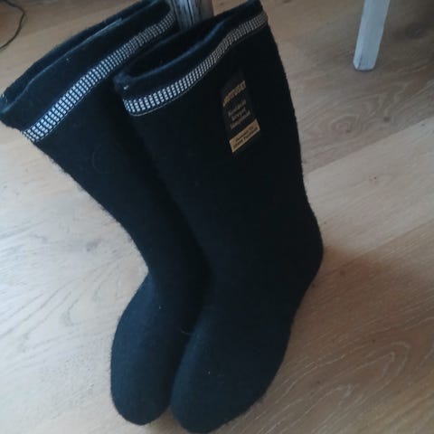 Mustat, vähän käytetyt ja pohjustetut kotimaiset Jantunen valmistamat huopikkaat. Koko on väljä.