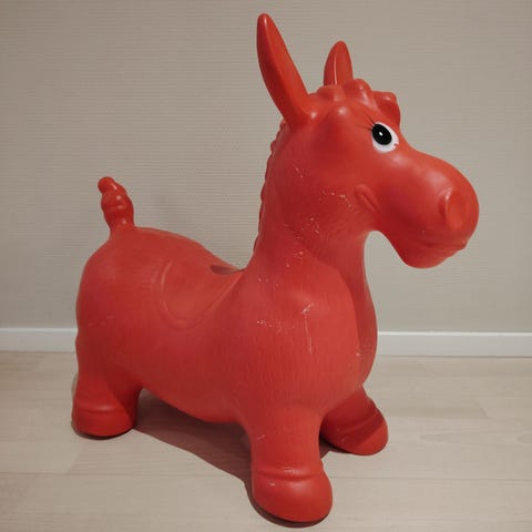 Myydään vaaleanpunainen pomppuponi tai oikeastaan yksisarvinen. Paljon käytetty ja piirrosjälkiä ja pinttymiä löytyy. On kuitenkin täysin ehjä.