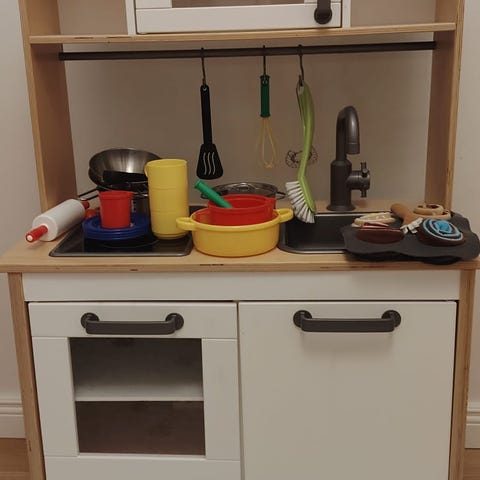 Puinen kuultovahattu lasten leikkikeittiö. Hienoa käsityötä.