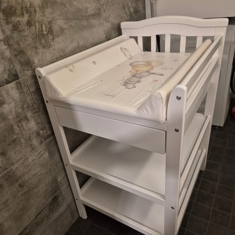 JLY hoitopöytä. Hyvässä kunnossa, muutamia naarmuja maalipinnassa, oon kuvannut ne ja näkyy kuvissa. Hoitoalustan saa halutessaan mukaan, ei ole enää ehjä kulmista kuten kuvista näkee mutta jos laittaa päällisen niin on toimiva vielä.