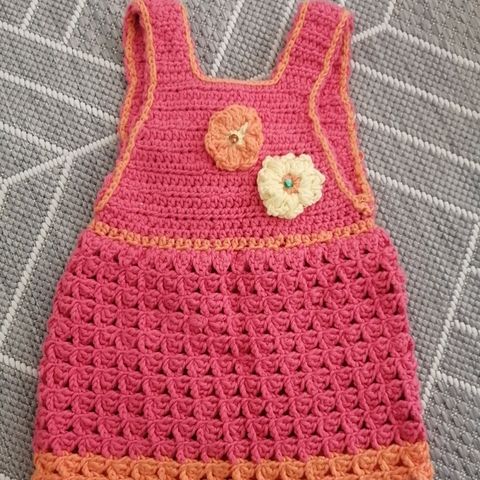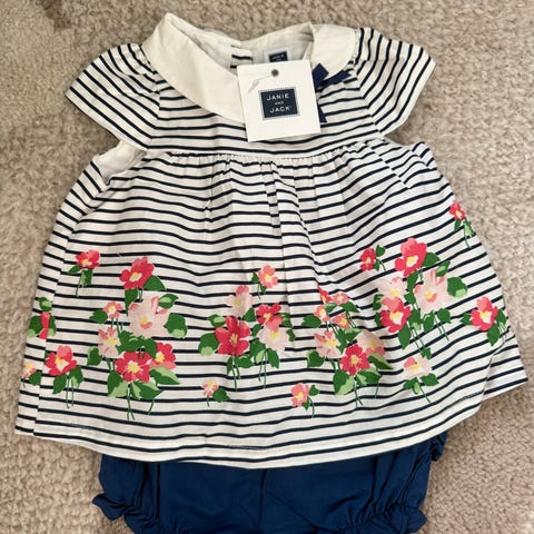Englannista ostettu mekko setti, johon kuuluu mekko, housuosa ja hattu. Koko on 0-6kk. Kangas ei jousta.