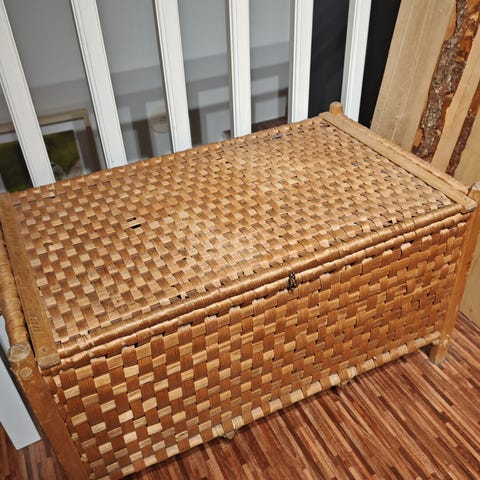 Varattu - Annetaam vanha ja käytössä ollut rottinkinen säilytyskori. Kori ihan ok. kunnossa, mutta käytön jälkiä löytyy. Korkeus n. 59 cm, leveys n. 48 cm syvyys n 31 cm. Kissatalous.