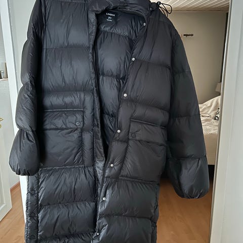 Laadukas ja hyväkuntoinen musta pitkä toppatakki H&M:n ja Kangolin yhteistyömallistosta. Reilu S-koko. Pieniä käytönjälkiä, ei reikiä, vetoketju kunnossa.