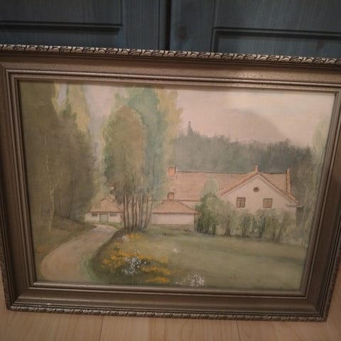 Maisemamaalaus järvimaisemalla ja kukkivalla puulla
