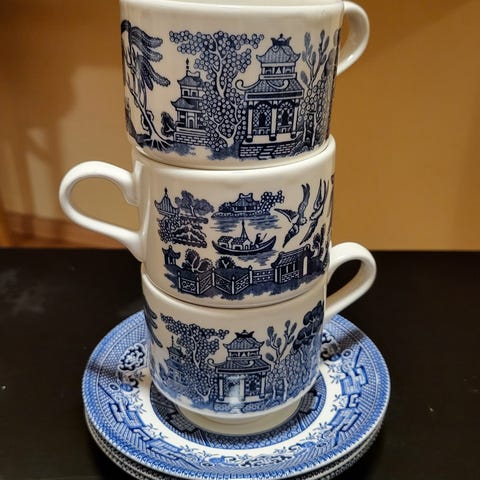 Astiat ovat hyväkuntoisia, ei krakeloitumaa, eikä palasia puutu, lasitus on kiiltävä ja ehjä. Jossain kupissa kukassa valkoinen pilkku, mutta hyvin huomaamaton. Lisäkuvia kommenteissa ja lisää saa kysymällä.