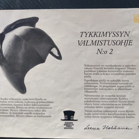 Suomen Kansallispukuneuvoston yleisohjeet k-pukujen perinteisestä valmistuksesta. Hame, esiliina, irtotasku, tykkimyssy ja miesten housut. Kussakin neljä sivua. Yht 25 €.