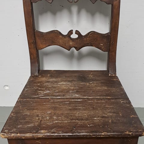 Kaiverrettu, puinen, hieman keinuva vanhan ajan työtuoli nahkapäällysteillä.