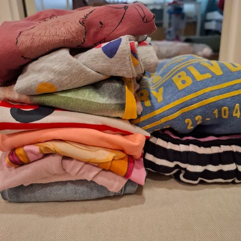 Kaikki olleet käytössä 5-6 vuotiaalla 110-116 koossa. Paljon käytettyjä, mutta vielä käyttöikää jäljellä. Kulumaa paitojen kuvissa ja vihreissä housuissa pieni reikä vasemmassa polvessa sekä nukkaa "värilipuissa" housujen sivussa.