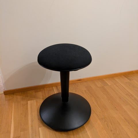 Ikean NILSERIK seisomatuki/työjakkara. Korkeuden säätö 51-71cm. Tuolin jalka mahdollistaa sekä perinteisen istumisen, että ”reunalla tasapainottelun”, ks. Ikean sivuilta.