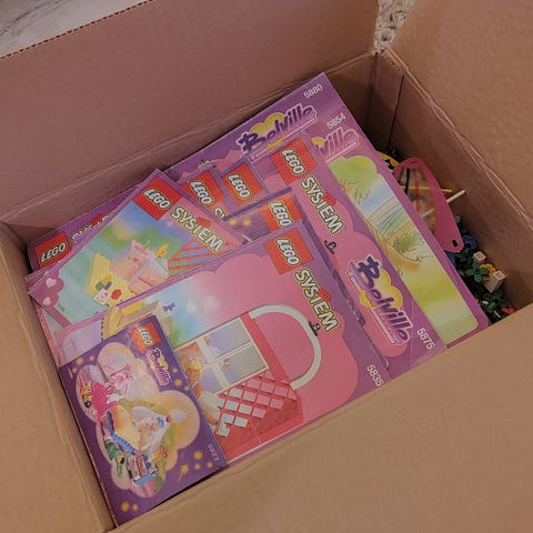 LEGO Belville leikkisetti sisältää linnan, hevosvaunut, erilaisia poneja , kukkia ja aitoja. Kaikki kuvassa näkyvät samaan settiin. Näillä on leikitty, mutta kaikki osat ovat ehjiä ja yhä leikkikelpoisia.