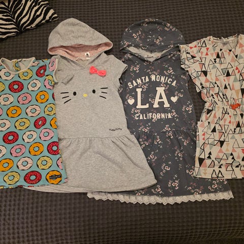 Neljä tyttöjen pitkähihaista mekkoa. Kolme H&M ja leopardikuvioinen Peuhu.