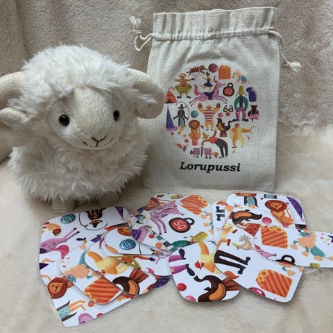 Lorupussi joka sisältää 24 lorua. Loru liittyy aina lorukortin kuvaan.