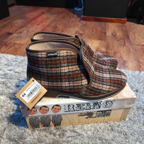 Uudet! Vain kokeiltu jalkaan. Reino-Tohvelit koko 43. Sisältää harmaan ruudullisen kuvion. Käyttötarkoituksena sisäjalkineet, jotka tarjoavat mukavuutta ja lämpöä. Pohja musta ja kestävä.