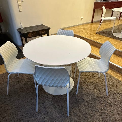 Valkoinen pyöreä pöytä ja 4 tuolia 100€