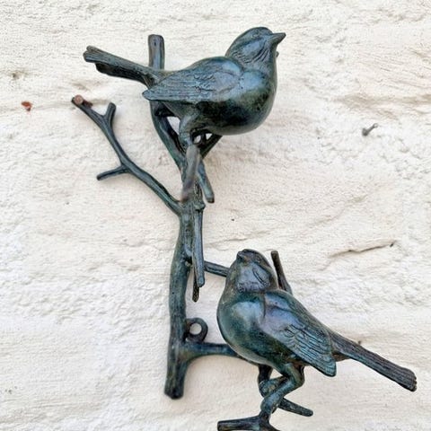 Kauniisti suunniteltu pronssinen seinäkoriste. Oksa, jossa on kaksi istuvaa lintua. Kaunis koriste. Sen mitat ovat noin: