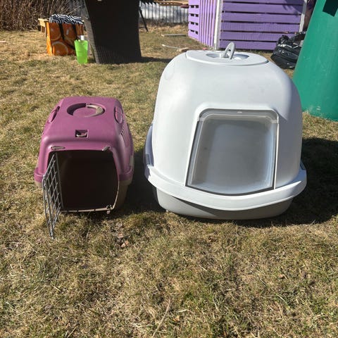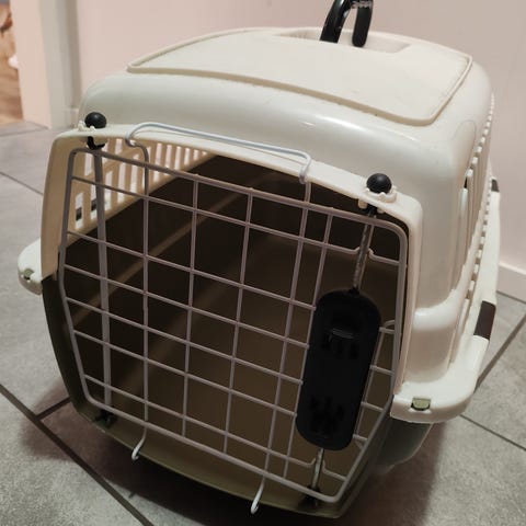 Kissan kuljetus koppa mitat korkeus n.32.5cm, leveys n.36.5cm. pituus n.57.5cm. Kaksi värinen.
