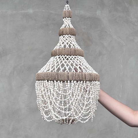 Shell-lyhty, joka on valmistettu sadoista pienistä valkoisista simpukoista, roikkuu koristeellisessa metallikehyksessä, joka on kääritty ruskeaan köyteen. Tämä roikkuva simpukkakoriste on käsityönä Indonesiassa valmistettu artesaanien toimesta, ja siihen liittyy usein pieniä epätäydellisyyksiä, kuten osittain kiertynyt metallikehys tai epäsäännöllisesti roikkuvat langat.