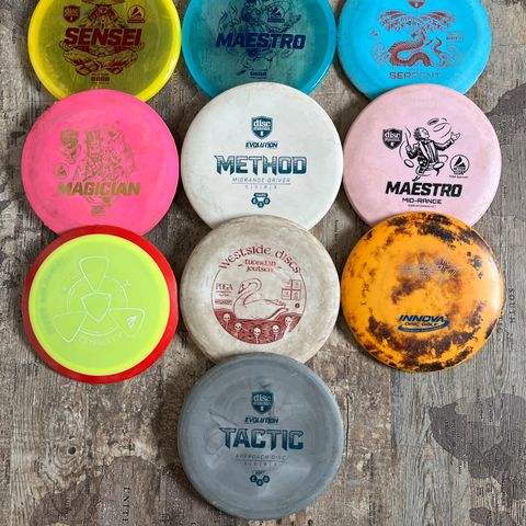 Myydään hyvään hintaan koko nippu kerralla. Noudettuna mieluiten. Löytyy sekalaisia kiekkoja. Saattaa olla pari hyvin vähän heitettyä, mutta suurin osa jonkun verran heittoja nähneitä.