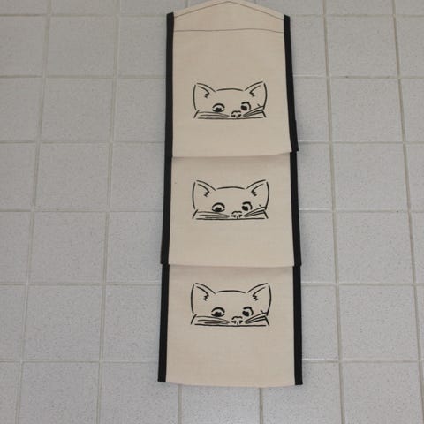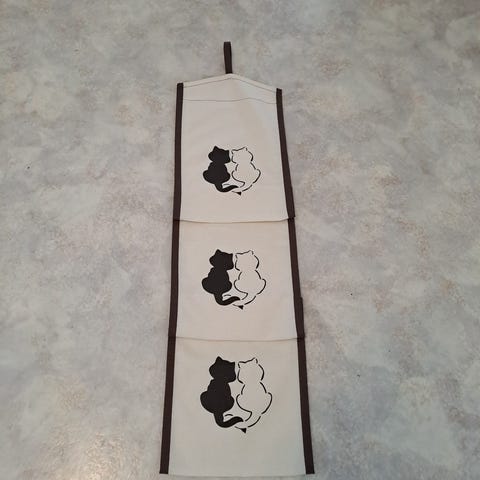 Uusi puuvillakankaasta ommeltu wc-paperiteline, johon käsinpainettu mustalla tassut/tassu kuvat.