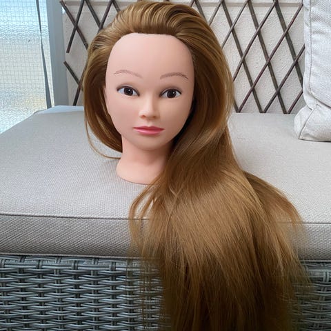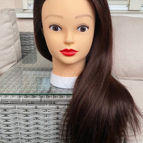 Hiusalan ammattilaisen nuken harjoituspää. 60cm pitkät luonnolliset hiukset.