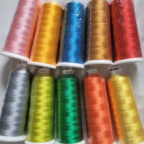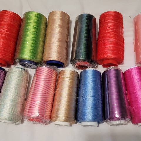Kuvanmukaiset 15 rll Madeiran viskoosibrodeerauslankaa. Jokaisessa rullassa 1000 metriä. Kaikki yhteensä 15 euroa