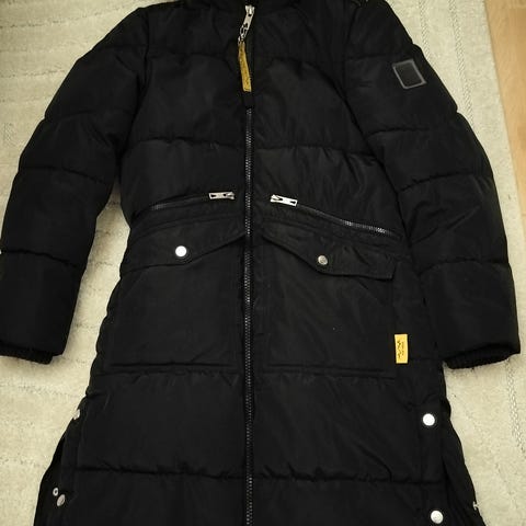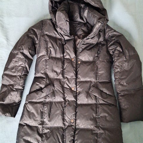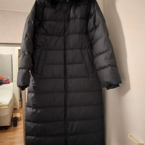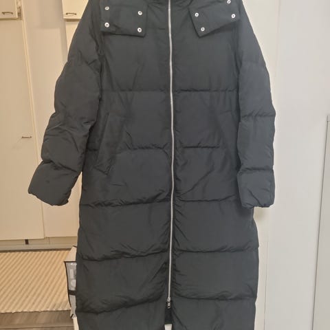 H&M pitkä untuvatakki naisille, koko S, väriltään musta. Takki on valmistettu untuvasta, mikä tarjoaa lämpöä ja mukavuutta kylmällä säällä.