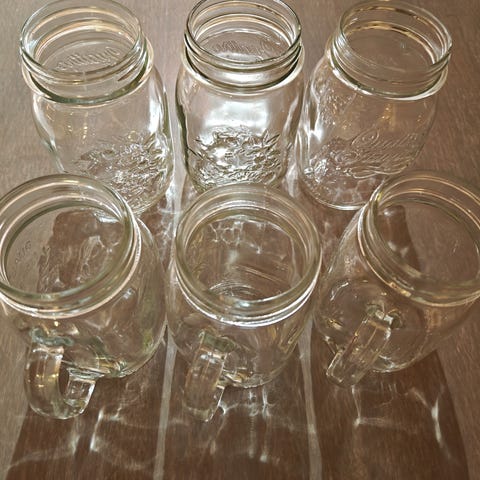 Kuusi upeaa kahvallista juomalasia. Olutlasit, teelasit, glögilasit. Yksi laseista ei yhtä kirkas kuin muut (viimeisen kuvan vasemman puolinen).