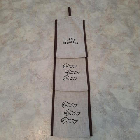 Uusi ommeltu wc-paperiteline, johon käsinpainettu tummanruskealla wc-paperirulla kuvat ja hotelli helpotus teksti.