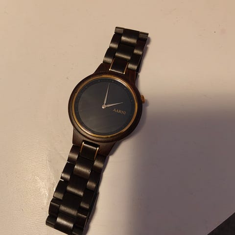 Jäänyt itsellä kaappiin lojumaan pari kertaa käytetty Aarnin rannekello. Kellon patteri on loppunut / pitää vaihtaa. Mukaan tulee kuvan Aarnin laatikko sekä työkalut mahdollista lyhentämistä tai pidentämistä varten.