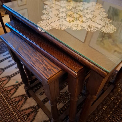 Näissä pöydissä on hyvät tukevat metalliset pöytälevyt, joissa vähän ajan patinaa. Ehjät kuitenkin ja hajuttomat ja ruostettomat. Jalat on puuta. Pöydät on monikäyttöisiä, sopivat olohuoneeseen ja myös lastenhuoneeseen.