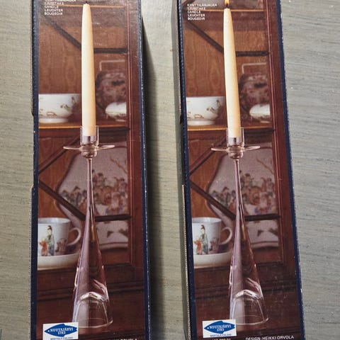Kaksi kaunista ja hyväkuntoista kynttilänjalkaa alkuperäisrasioissaan.