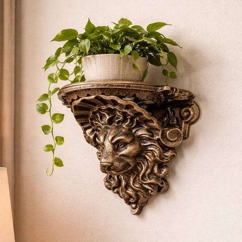 Koristeltu seinälaatta leijonan päällä, pronssin näköinen.