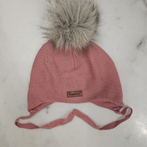 Metsolan pehmeä pupumyssy koossa 1-2y. Vuori puuvillaneulosta ja päällinen 100% moulesingvapaata merinovillaa. Kunto hyvä mutta pientä lankavetoa löytyy, näkyy kuvissa.
