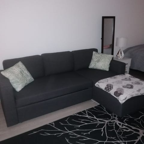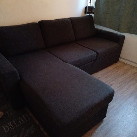 Kolmen istuttava divaanisohva, divaaniosan voi vaihtaa molemmin puolin (vaatii purkamista), ja sohvan voi levittää vuodesohvaksi.