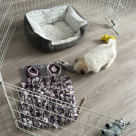Myytävänä 8-palainen Little Bigger pentuaitaus (korkeus 90cm) sekä nelikulmainen vedenpitävä musta alusmatto 165x190.