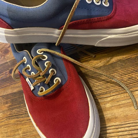 Vansin keinonahkaiset tennarit, vähän enemmän pehmustetut kuin perusmalli. Uudet nauhat vaihdettu.