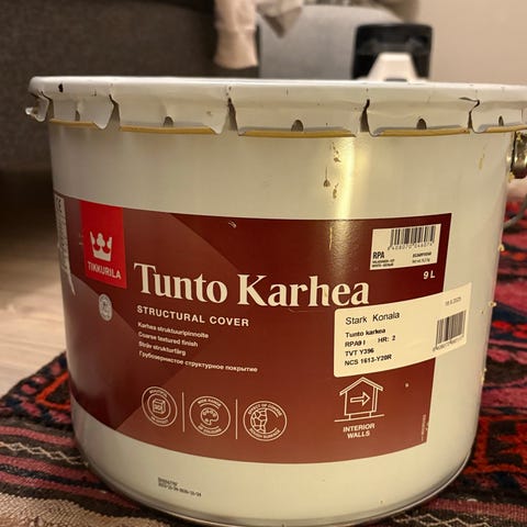 Valkoinen, karkean pinnoitteen luova maali. Vain vähän käytetty 2,7 litran purkista ja sisällä säilytetty. Nouto Malminkartanosta.