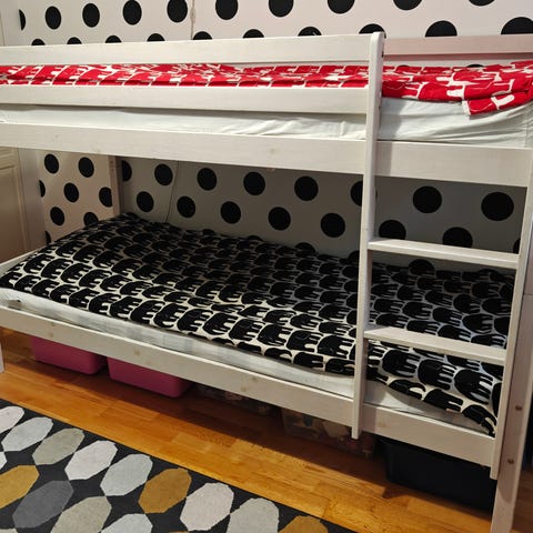 Myydään Jyskin kerrossänky ja sen alle sopivat laatikot. Kerrossänkyyn mahtuu 90x200 patjat. Leveys kokonaisuudessaan on 207 ja syvyys 97. Patjat (Ikea) saa ostaa halutessaan edullisesti mukaan myös.
